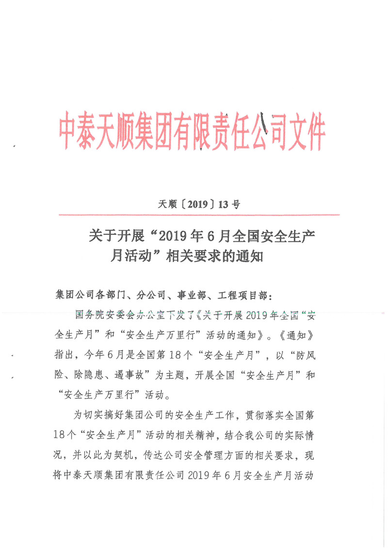 關于開展“2019年6月全國安全生產月活動”相關要求的通知